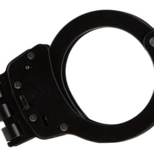 • Metal handcuffs open on white background.
