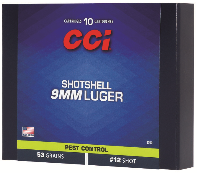Description ….: CCI CENTERFIRE SHOTSHELL – PEST CONTROL Caliber ……..: 9MM LUGER Shot Size ……: #12 Bullet Weight ..: 53 GRAIN Bullet Type ….: Muzzle Velocity : 1450 FEET PER SECOND Box Count ……: 10 ROUNDS Item # ………: 3790