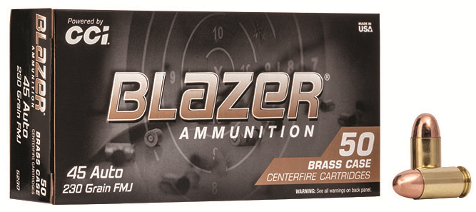 Description ….: CCI BLAZER AMMUNITION – Blazer Brass Caliber ……..: .45 AUTO Primer ………: Bullet Weight ..: 230 GRAIN Bullet Type ….: FULL METAL JACKET ROUND NOSE Muzzle Velocity : 830 FEET PER SECOND Box Count ……: 50 ROUNDS Item # ………: 5230