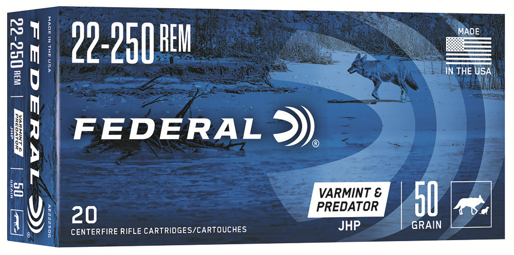 Description ….: FEDERAL AMERICAN EAGLE CENTERFIRE RIFLE AMMUNITION Caliber ……..: .22-250 REMINGTON Bullet Weight ..: 50 GRAIN Bullet Type ….: JACKETED HOLLOW POINT Muzzle Velocity : FEET PER SECOND Box Count ……: 20 ROUNDS Item # ………: AE22250G