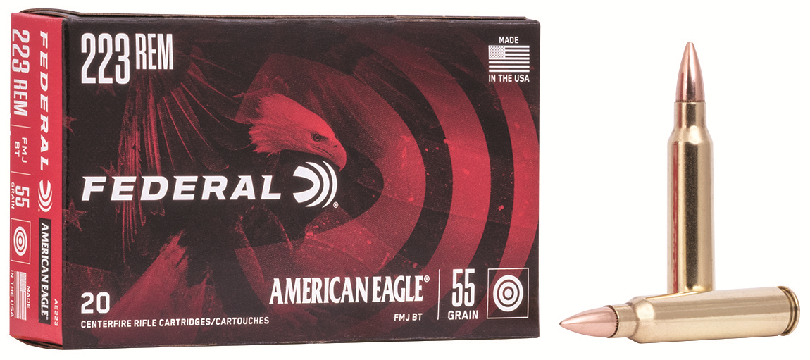Description….: AMERICAN EAGLE CENTERFIRE RIFLE BALLISTICS Caliber……..: 223 REMINGTON (5.56x45mm) Bullet Weight..: 55 GRAIN Bullet Type….: FULL METAL JACKET BOAT-TAIL Factory Primer.: 205 Muzzle velocity: 3240 FEET PER SECOND Quantity…….: 20 RD PER BOX Usage……….: TARGET SHOOTING TRAINING PRACTICE