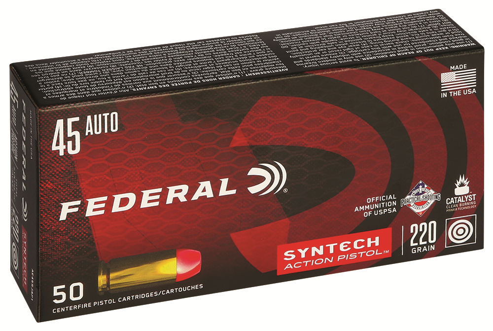 Federal American Eagle Syntech 45 ACP TSJ Handgun Centerfire Ammunition Caliber…………..: 45 ACP Bullet Weight …: 230 GRAINS Bullet Type ……: Total Synthetic Jacket Muzzle Velocity: 830 FPS Quantity………..: 50 RDS/BOX