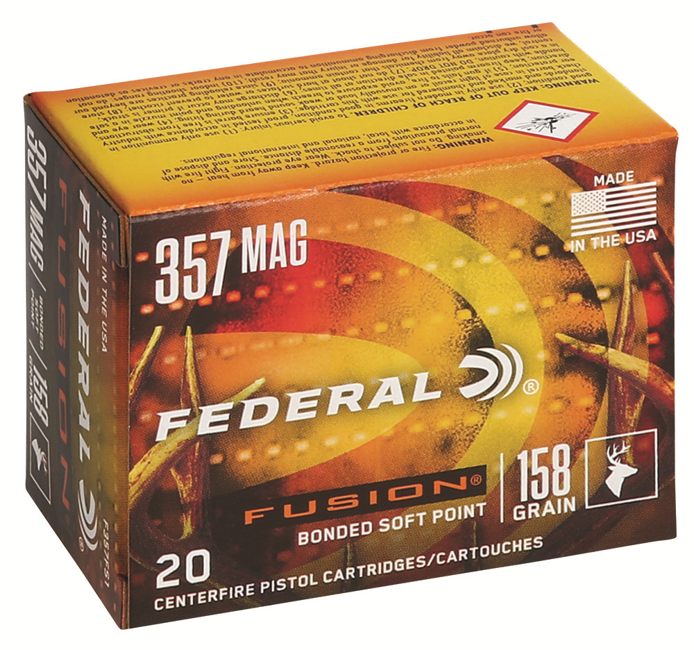 Description ….: FEDERAL FUSION HANDGUN AMMUNITION Caliber ……..: 357 MAGNUM Bullet Diameter : Bullet Weight ..: 158 GRAIN Bullet Type ….: FUSION Primer # …….: 100 Muzzle Velocity : 1240 FEET PER SECOND Box Count ……: 20