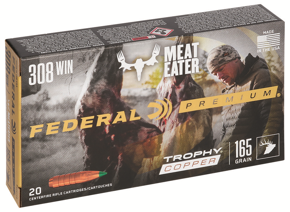 Description ….: FEDERAL PREMIUM VITAL SHOK RIFLE AMMUNITION Caliber ……..: 308 WINCHESTER (7.62x51mm) Bullet Diameter : Bullet Weight ..: 165 GRAIN Bullet Type ….: TROPHY COPPER Muzzle Velocity : 2700 FEET PER SECOND Box Count ……: 20RD Item # ………: P308TC2