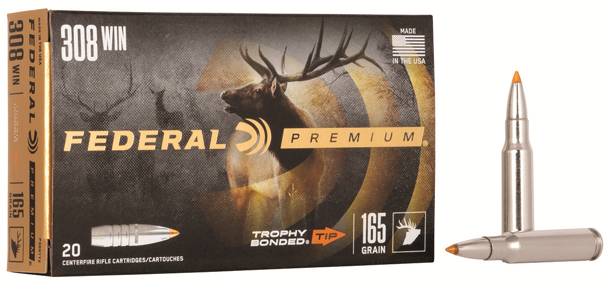 Description ….: FEDERAL PREMIUM VITAL SHOK RIFLE AMMUNITION Caliber ……..: 308 WINCHESTER (7.62x51mm) Bullet Diameter : Bullet Weight ..: 165 GRAIN Bullet Type ….: TROPHY BONDED TIP Muzzle Velocity : 2700 FEET PER SECOND Box Count ……: 20RD Item # ………: P308TT2