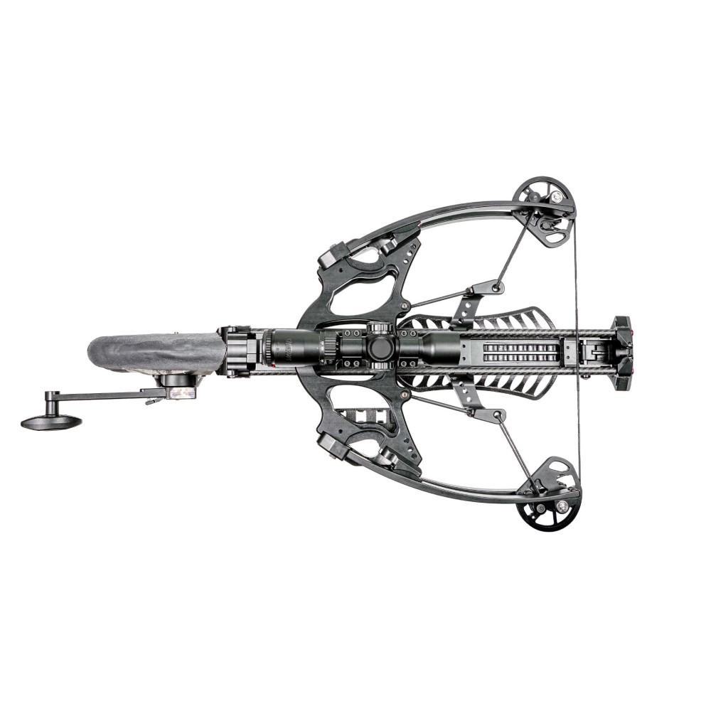 Unlike the one-piece aluminum rail concepts of conventional crossbow designs that rob speed efficiency and bolt life the stock of the AX405 eliminates the rail and utilizes dual carbon guide rods along the entire length of the stock. When combined with the shoot through riser and a roller rest on the bow’s front end these features create a free-floating arrow system that mitigates contact friction and torque along the arrow’s entire path further enhancing efficiency accuracy and speed output.