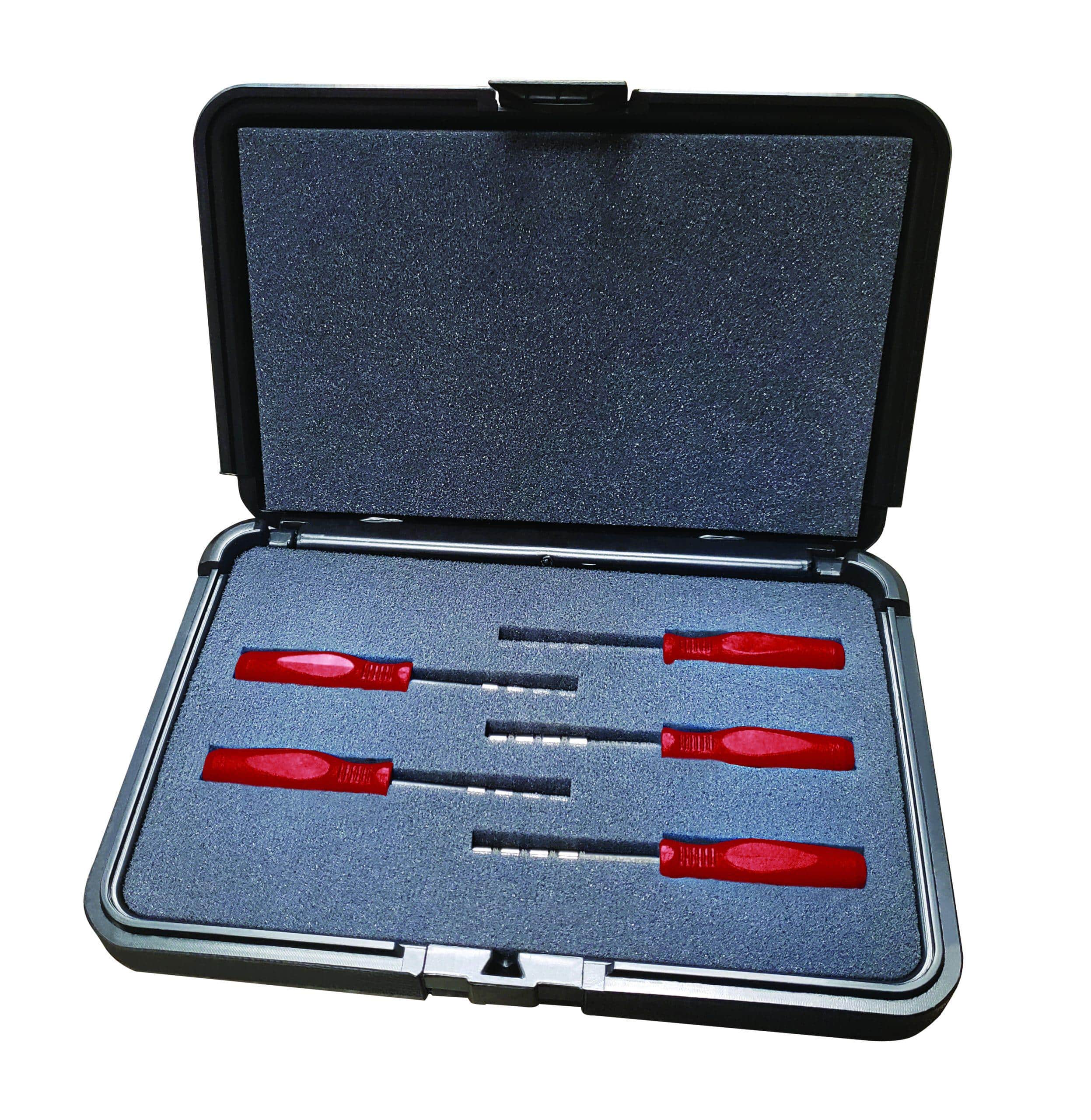 This kit includes all five calibers available. Each Neck Tension Gage (NTG) Inspection Tool consists of four stepped diameters that increase in size until reaching the handle. Each diameter is etched on the metal tool.