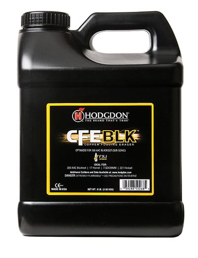 Hodgdon BLACK8 CFE BLK Smokeless Powder Rifle NEW SPHERICAL PROPELLANT DESIGNED EDXPRESSLY FOR THE SUB-SONIC 300 BLACKOUT Copper Fouling Eraser (CFE) leaves no copper residue, extending accuracy for longer shooting periods & making cleanup quick & easy Functions AR-15 rifles throughout the range of bullet weights Works in 17 Hornet, 221 Fireball, 6.8 Remington SPC & 7.62x39mm 8 LB KEG