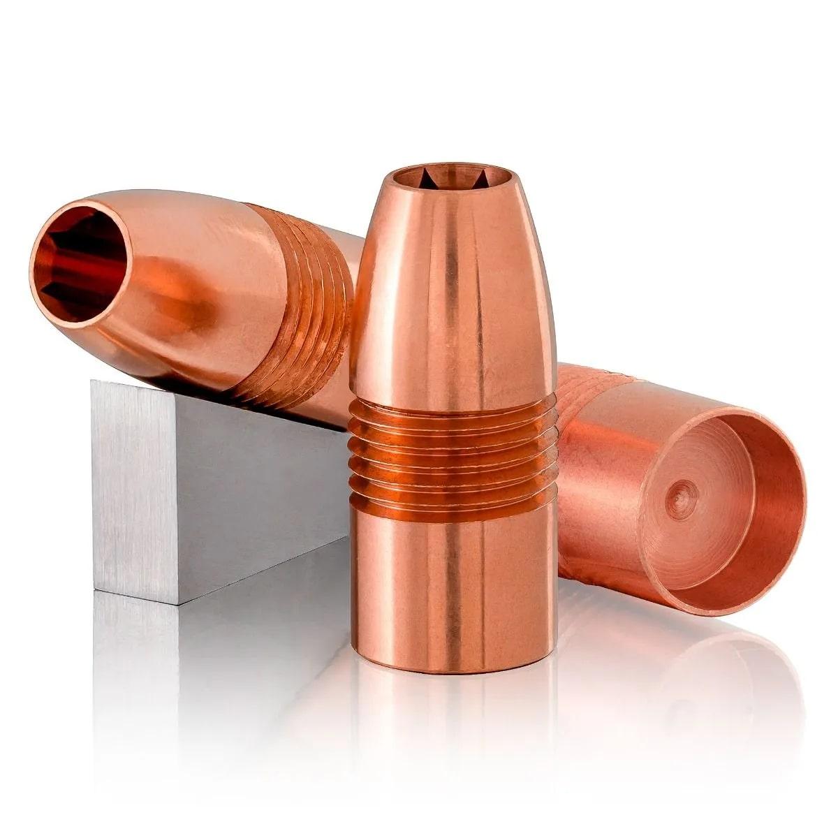 Lehigh originated Controlled Fracturing Technology. These bullets are designed to deliver maximum terminal performance. Controlled Fracturing bullets are produced from either solid copper or solid brass and are pre-stressed at specific points so that after a predetermined penetration depth the razor-edge petals deploy releasing an energy spike and then separate and radiate outward from the primary path of the bullet. The bullet shank now back to bore diameter continues penetrating straight and deep along the initial impact path.