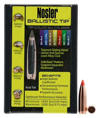 Nosler engineered the Ballistic Tip Hunting bullet to be very predictable and extremely forgiving. The polymer tip resists deformation in the magazine, initiates expansion upon impact and is color-coded by caliber. The fully tapered jacket and special lead alloy core allows controlled expansion and optimum weight retention at all practical velocity levels. A heavy jacket base prevents bullet deformation during firing and acts as a platform for large diameter mushroom. Nosler’s unique solid base boat-tail design, combined with the polycarbonate tip, dramatically increases long-range ballistic efficiency.