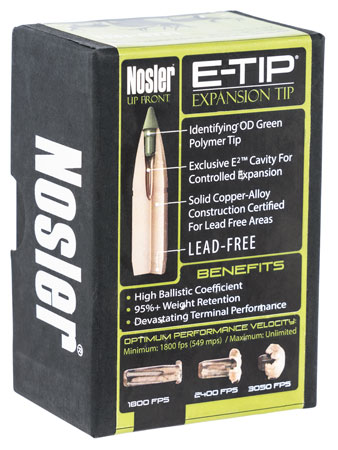 Nosler’s E-TIP, Lead Free, Expansion Tip bullets upon impact, Nosler’s exclusive E Cavity (Energy Expansion Cavity) allows for immediate and uniform expansion, yet retains 95% weight for improved penetration. The E Cavity provides amazing stopping power and peerless penetration over a broad spectrum of impact velocities, rivaling even the highest quality lead-core bullets.