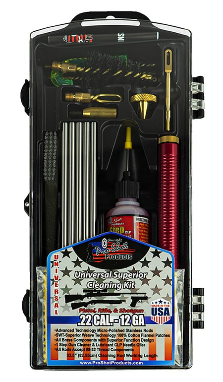 Premium Universal Box Cleaning kit is suitable for firearms from .22 caliber to 10 gauge shotguns. It features rods, patches, tips, chemicals, and more, making it easy and affordable to clean all of your guns.