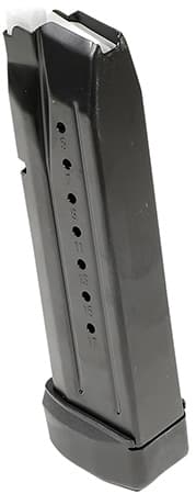 The Smith & Wesson OEM magazine has a blued metal construction. The OEM Magazine is compatible with competitor 9mm pistol. This Smith & Wesson model has a 17-round capacity.