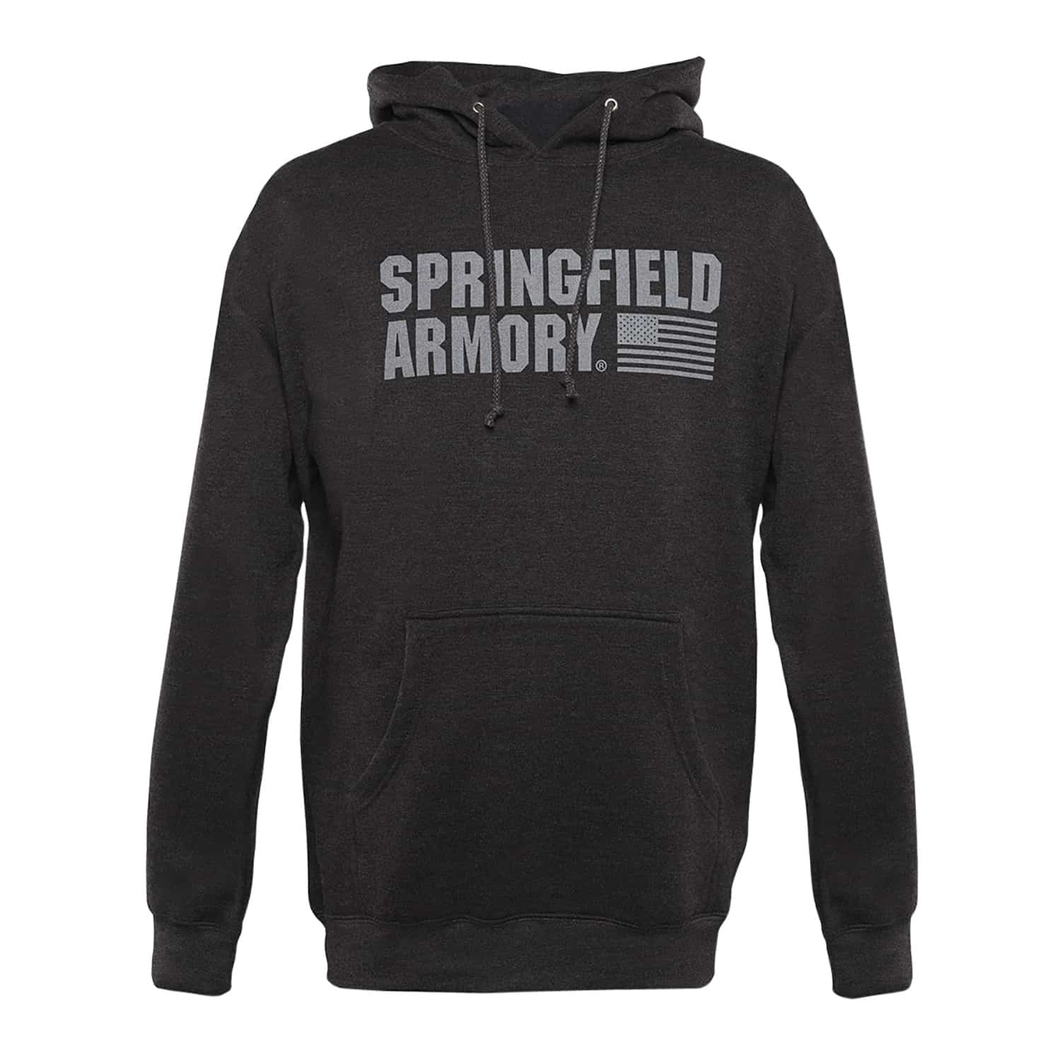 Springfield Armory sweatshirt with a fleece lined hood and nickel eyelets. Made with 55% cotton/45% polyester blend and “Springfield Armory” and American flag on the front.