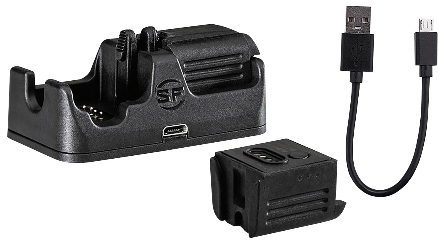 SureFire Dual-Charge Cradle with B12 Battery kit. Plug the cradle into an AC or DC source using the included Micro-USB to USB Type-A cord. Charges two batteries in three hours. Includes B12 battery for the SureFire XSC series Weaponlight.