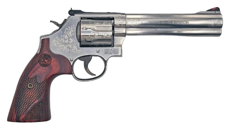 Brand: Smith & Wesson Model: Model 686 PLUS – Distinguished Combat Magnum Type: Revolver: Double Action Caliber: 357 Finish: Satin Stainless Finish Action: Double Action Stock: Checkered Hardwood Laminate With Logo Sight: Front: Red Ramp Rear: Adjustable Barrel Length: 6 Capacity: 7 Safety: Internal Lock Features: Round Butt, Forged Hammer And Trigger; Drilled and Tapped Armory Grade Exclusive Engraving performed by Automated Finishing Co for Camfour Customs
