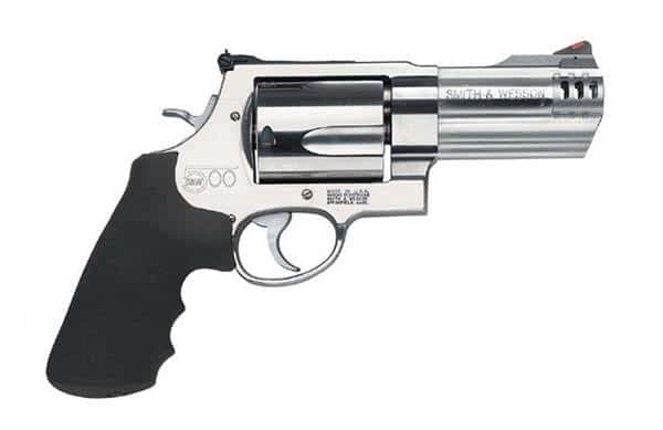 Brand: Smith & Wesson Model: Model 500 Type: Revolver: Double Action Caliber: 500 SW Magnum Finish: Satin Stainless Steel Action: Double Action Stock: Hogue Sorbothane Recoil Absorbing Grip Sight: Front: Red Ramp Rear: Micrometer Click Blk Blade Barrel Length: 4 (3 + 1 Compensator) Overall Length: 10.25 Weight: 56 oz Capacity: 5 Safety: Internal Lock Receiver: Satin Stainless Steel Features: Removeable Inerchangeable Compensator:; One for Lead Ammo and One for Jacketed Ammo