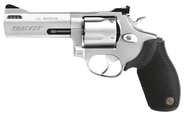 Brand: Taurus Model: 44 Tracker Type: Revolver: Double Action Caliber: 44M Finish: Stainless Steel Action: Double Action Stock: Ribber Grip Sight: Front: Ramp Rear: Adjustable Barrel Length: 4 Overall Length: 9 Weight: 34 oz Capacity: 5 Safety: Taurus Security System, Transfer Bar Features: Ported Barrel