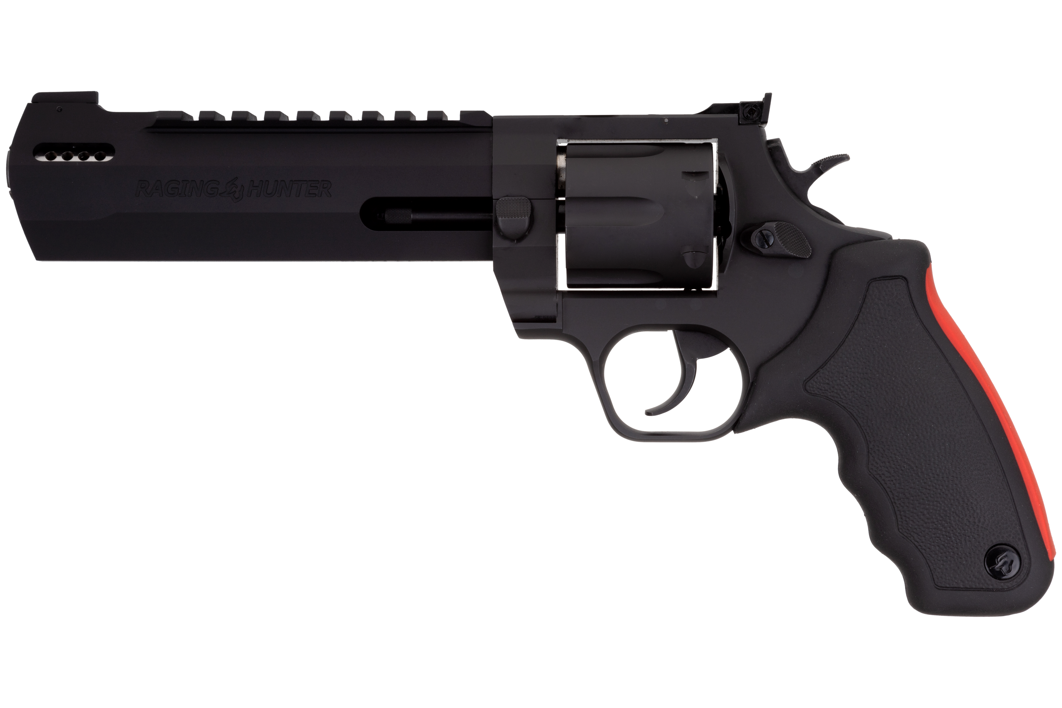 Brand: Taurus Model: Raging Hunter Type: Revolver: Double Action Caliber: 44M Finish: Matte Black Action: Double Action Stock: Rubber W/ Cushioned Insert Grip Sight: Front: Fixed Rear: Adjustable Barrel Length: 6.75 Overall Length: 12.475 Weight: 55 oz Capacity: 6 Safety: Transfer Bar Features: Ported Barrel; Spurred Hammer, Picatinny Rail