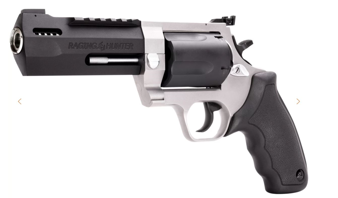 Brand: Taurus Model: Raging Hunter Type: Revolver: Double Action Caliber: 460 Finish: Black|Stainless Steel Action: Double Action Stock: Rubber W/ Cushioned Insert Grip Sight: Front: Fixed Rear: Adjustable Barrel Length: 5.125 Overall Length: 10.85 Weight: 55 oz Capacity: 5 Safety: Transfer Bar Features: Ported Barrel; Spurred Hammer, Picatinny Rail