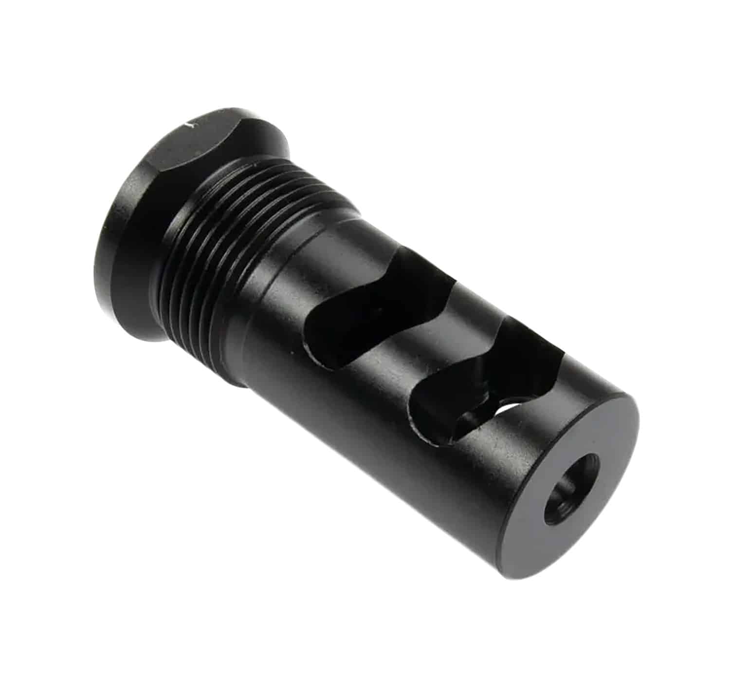 The 5.56 caliber flat back Rapid-Thread Muzzle Brake is a robust and efficient suppressor attachment for Whisper suppressor on barrels with a diameter greater than .775″ behind the front threads.