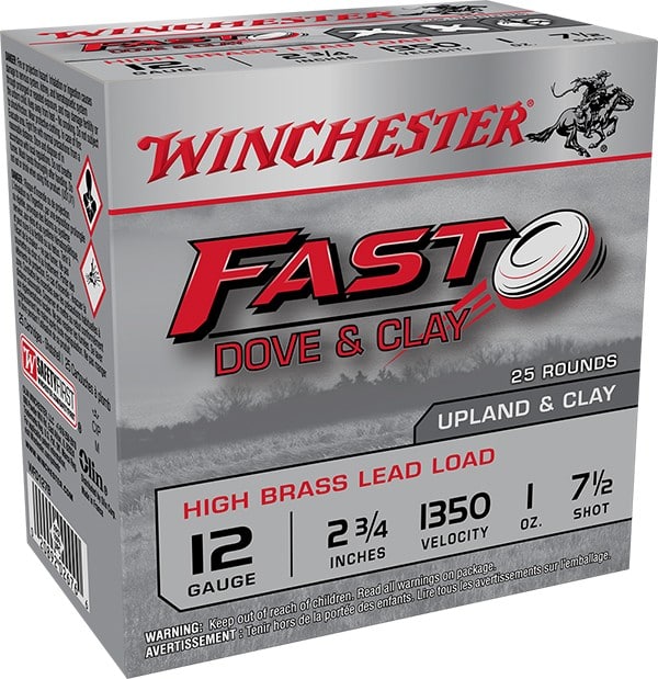 WINCHESTER, ITEM WFD127B – SHOTSHELL, FAST DOVE & CLAY, 12 GA 2-3/4” #7.5 HIGH BRASS LEAD LOAD, 1 OZ, VELOCITY 1350, 25 ROUNDS PER BOX